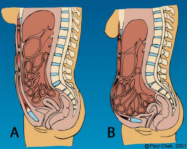 When the abdominal wall works correctly (Figure A), the internal organs are properly supported and rest in the correct position to maximally benefit from the massage given by diaphragmatic movement.